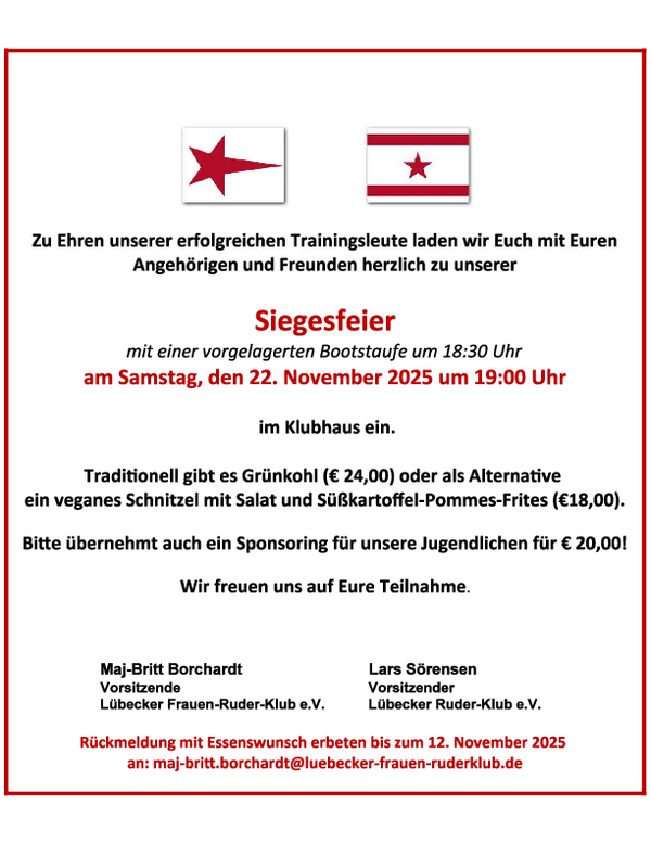 Zu Ehren unserer erfolgreichen Trainingsleute Siegesfeiermit einer Bootstaufe um 18:30 Uhr im Vorfeld am Samstag, den 22. November 2025 um 19:00 Uhrim Klubhaus Traditionell gibt es Grünkohl (€ 24,00) oder als Alternative Wir würden uns freuen, wenn Ihr mit einem Sponsoring in Höhe von € 20,00 unsere Jugendlichen unterstützt. Wir freuen uns auf Eure Teilnahme! Maj-Britt Borchardt – Vorsitzende, Lübecker Frauen-Ruder-Klub e.V. Rückmeldung mit Essenswunsch erbeten bis zum 12. November 2025 |